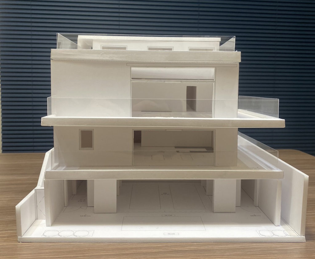 二世帯住宅としての機能性にも配慮し、世帯間の適度な距離感を保ちながらも、将来的な使いやすさを見据えた明快な動線計画を立案。道路からのアプローチの取り方やプライバシーへの配慮も丁寧に検討し、それぞれの世帯が快適に暮らせる間取りに仕上げています。