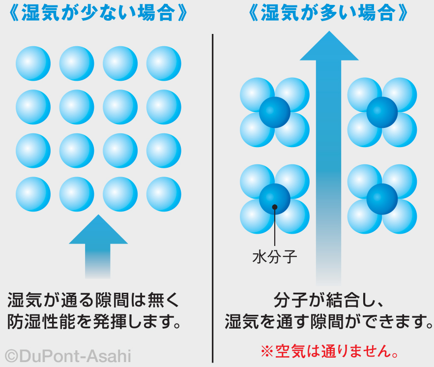 可変型は、水分子の影響により材料内部に隙間が生じ、透湿性能が変化するという説明がされています。