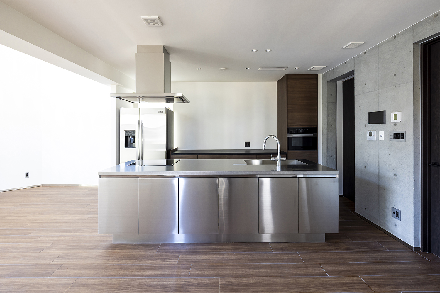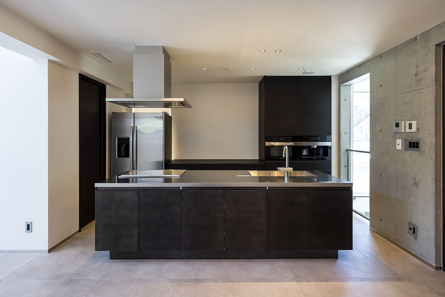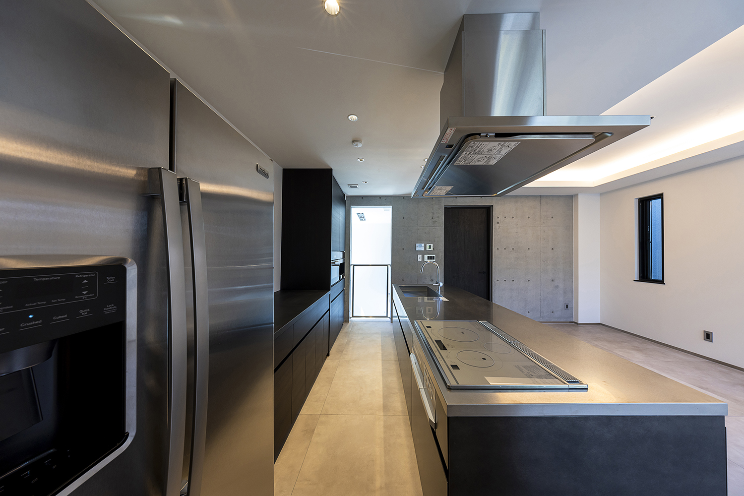 カップボードはパナソニックのLクラスを採用し、こちらにはミーレのオーブンレンジとコーヒーメーカーをビルトインしています。異なるメーカーを組み合わせていますが、空間全体は「ステンレス」「黒木目」「コンクリート」「アルミ」といった素材をバランスよく構成し、シンプルでありながら存在感のあるスタイリッシュなインテリアに仕上げています。