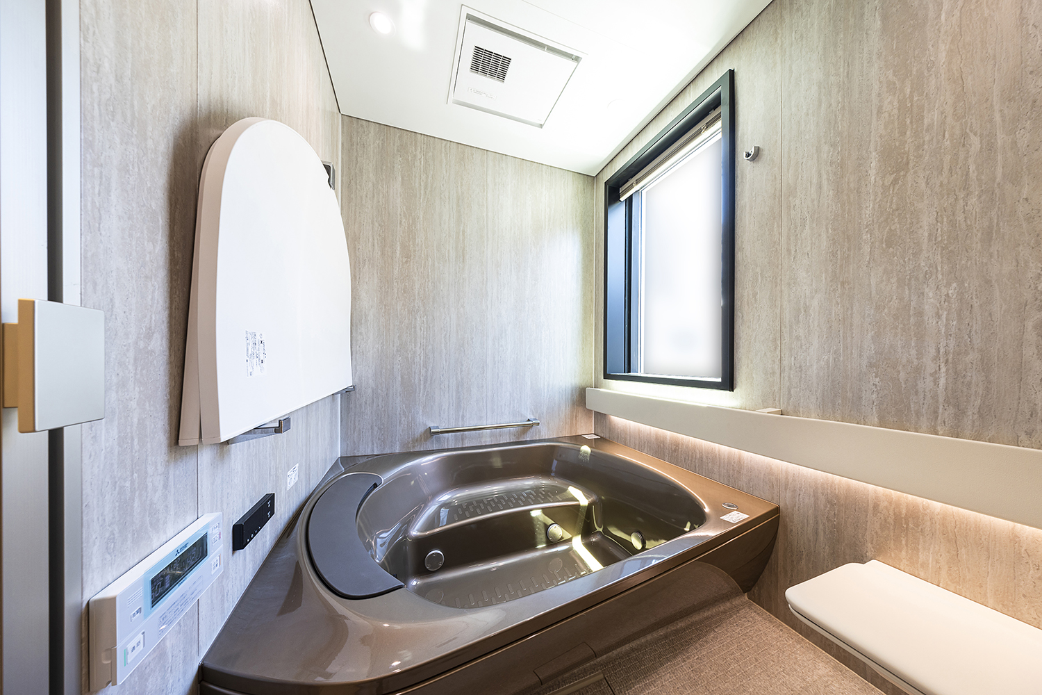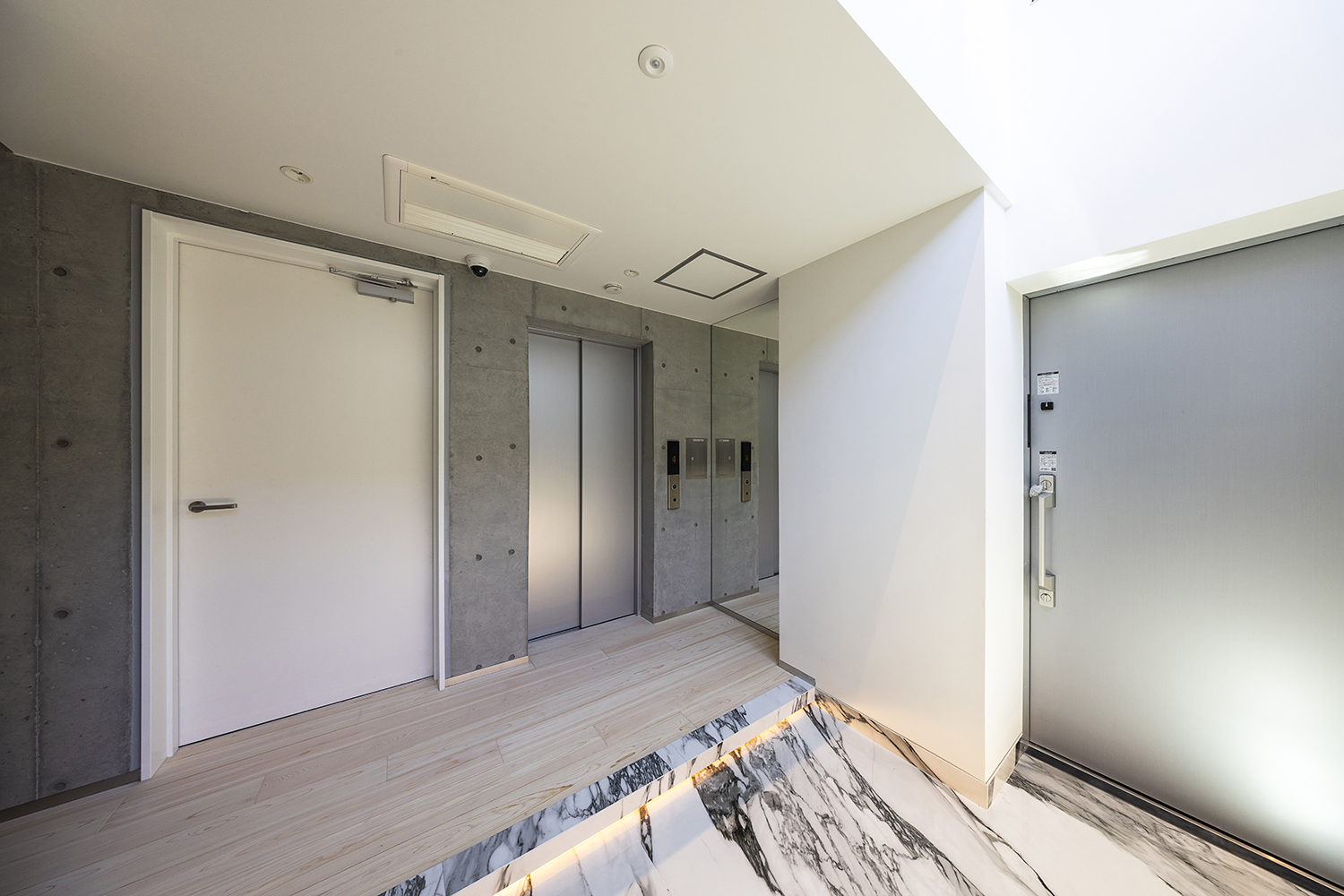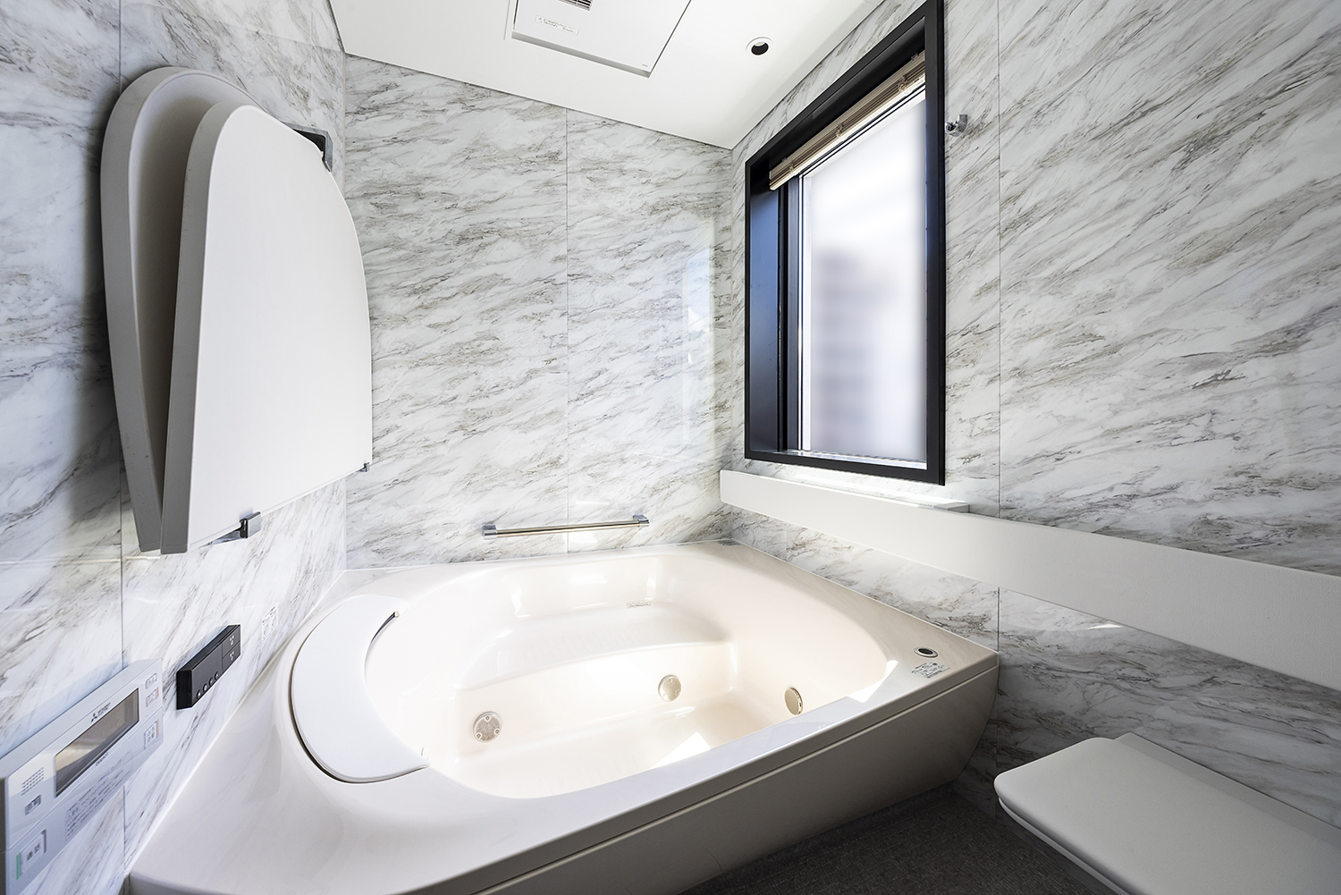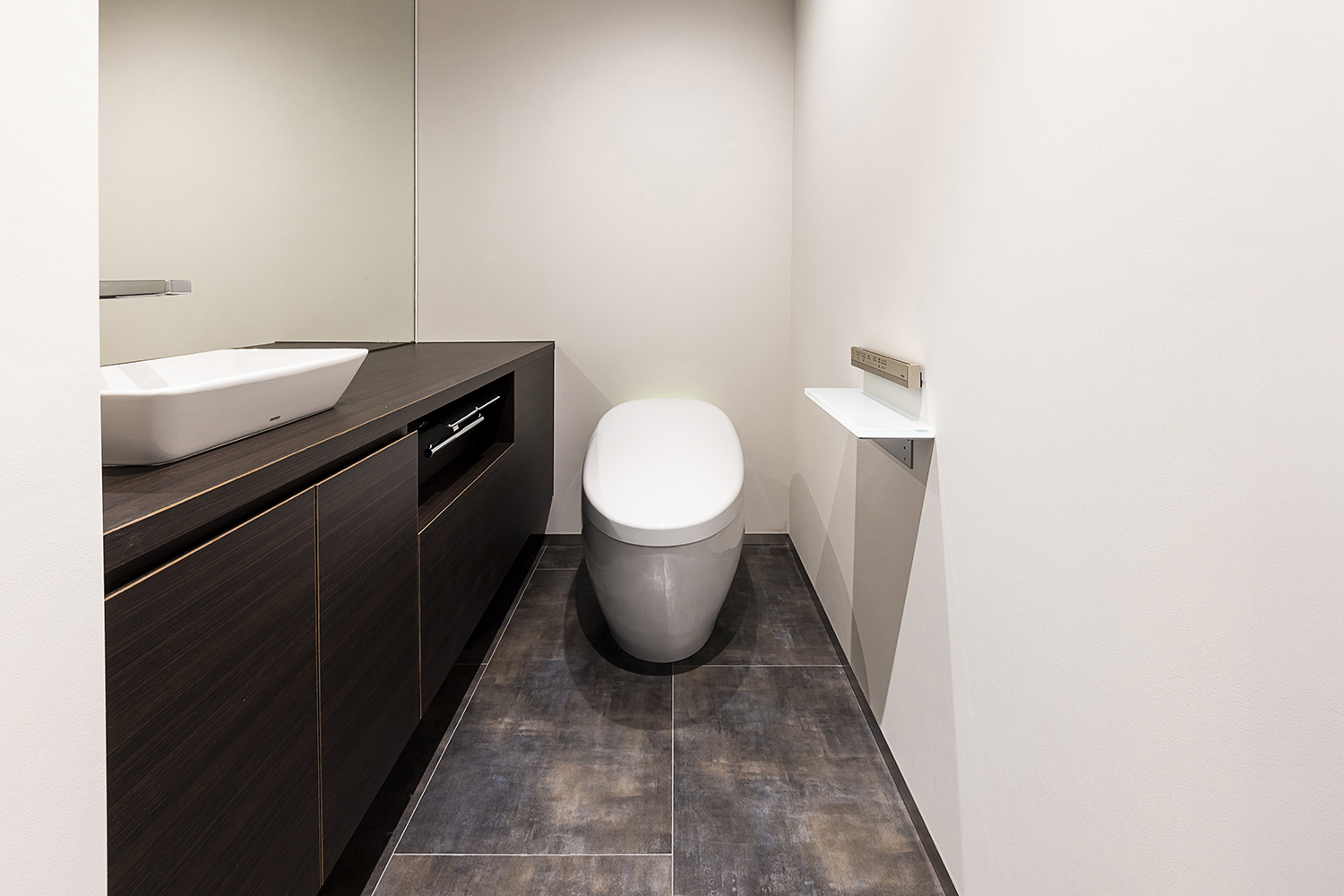 床には迫力のある大判タイルを全面に施工し、壁面には鏡を取り入れることで空間の広がりを演出しました。